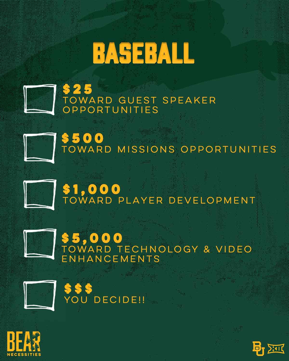 Gifts to the Baseball Excellence Fund support student-athlete scholarships, equipment, travel, and coaching. Gifts made on Giving Day are not eligible for benefits.