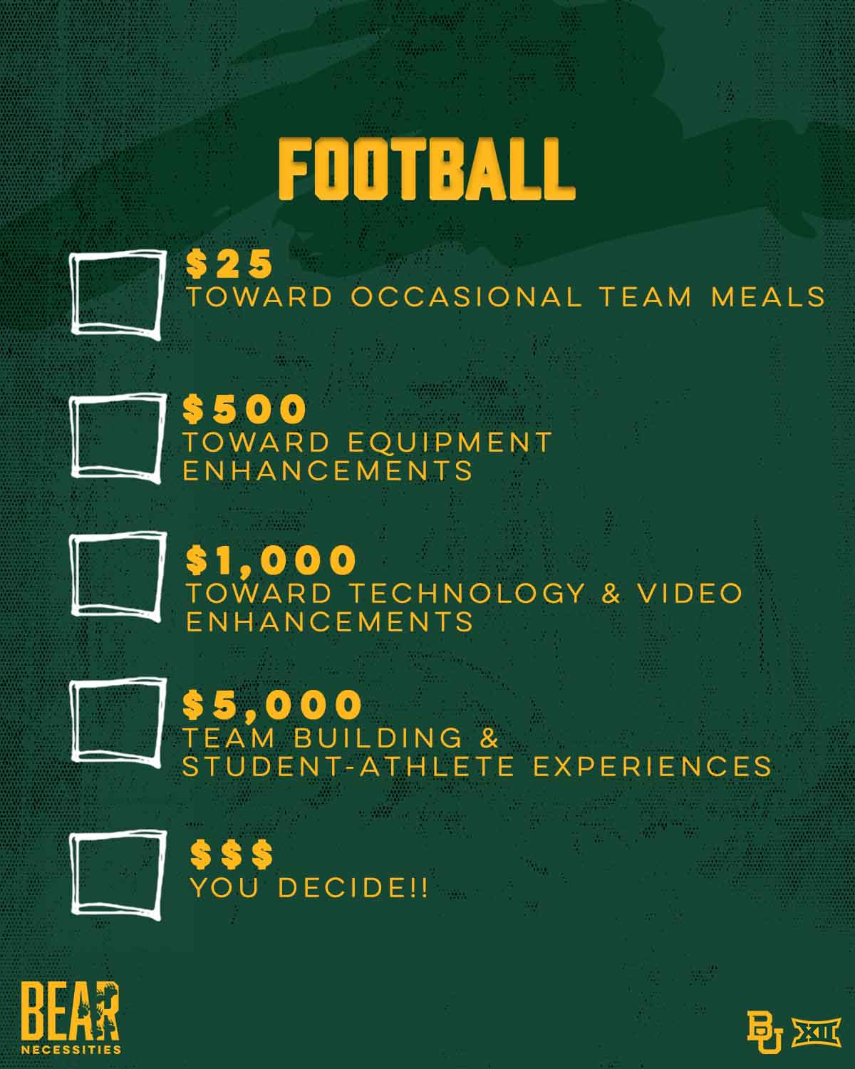 Gifts to the Football Excellence Fund support student-athlete scholarships, equipment, travel, and coaching. Gifts made on Giving Day are not eligible for benefits.