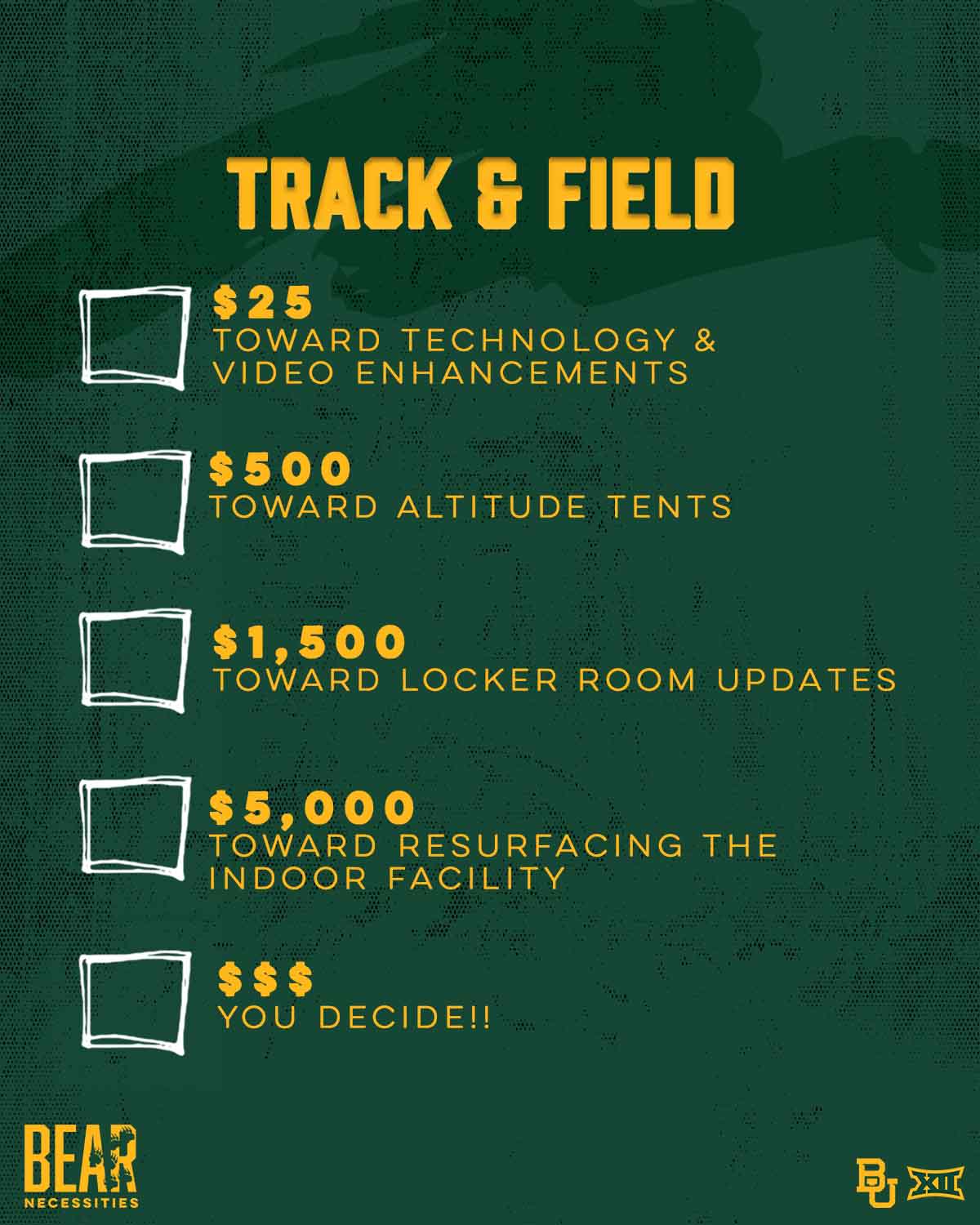 Gifts to the Track & Field Excellence Fund support student-athlete scholarships, equipment, travel, and coaching. Gifts made on Giving Day are not eligible for benefits.