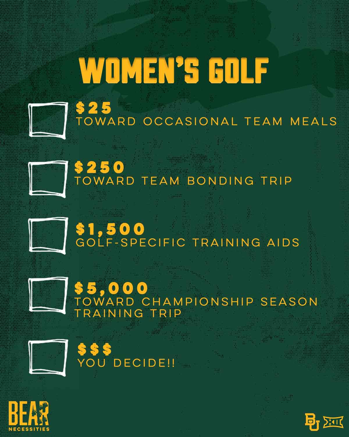 Gifts to the Women's Golf Excellence Fund support student-athlete scholarships, equipment, travel, and coaching. Gifts made on Giving Day are not eligible for benefits.