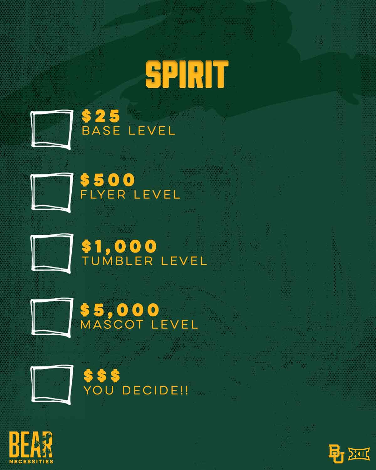 Gifts to the Baylor Spirit Squad support student-athlete scholarships, equipment, travel, and coaching. Gifts made on Giving Day are not eligible for benefits.